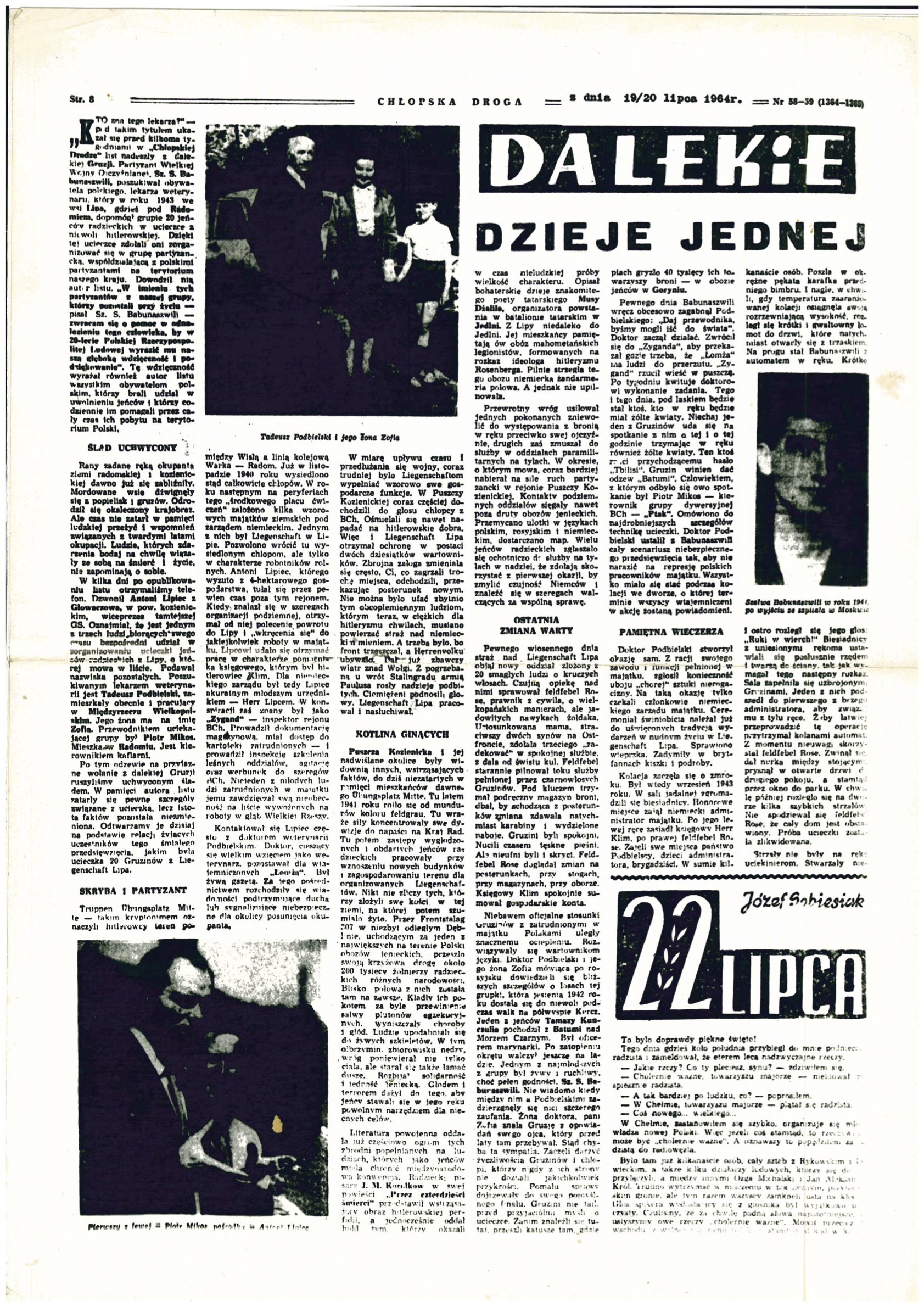 „Kto zna tego lekarza?” – pod takim tytułem ukazał się przed kilkoma tygodniami w „Chłopskie Drodze” list nadeszły z dalekiej Gruzji. Partyzant Wielkiej Wojny Ojczyźnianej, Sz. S. Babunaszwili, poszukiwał obywatela polskiego, lekarza weterynarii, który w roku 1943 we wsi Lipa, gdzieś pod Radomiem, dopomógł grupie 20 jeńców radzieckich w ucieczce z niewoli hitlerowskiej. Dzięki tej ucieczce zdołali oni zorganizować się w grupę partyzancką, współdziałającą z polskim partyzantami na terytorium naszego kraju. Dowodził nią autor listu. „W imieniu tych partyzantów z naszej grupy, którzy pozostali przy życiu – pisał Sz. S. Babunaszwili – zwracam się o pomoc w odnalezieniu tego człowieka, by w 20-lecie Polskiej Rzeczypospolitej Ludowej wyrazić mu naszą głęboką wdzięczność i podziękowanie”. Tę wdzięczność wyrażał również autor listu wszystkim obywatelom polskim, którzy brali udział w uwolnieniu jeńców i którzy codziennie im pomagali przez cały czas ich pobytu na terytorium Polski.