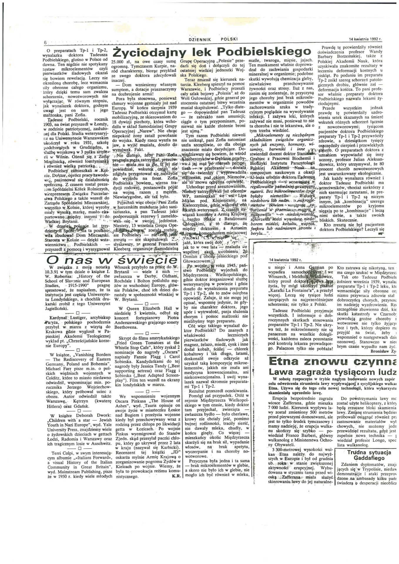 Tak oto Tadeusz Podbielski, żołnierz września 1939, wynalazca preparatu Tp-1 Tp-2 leku, który wzmacniając siły obronne organizmu przywraca zdrowie stał się dobroczyńcą chorych, przynosząc im nadzieję wyzdrowienia. Rzecz szczególnie zbawienna dziś, kiedy skutki katastrofy w Czernobylu powodują groźne choroby nowotworowe nie tylko żyjących, lecz i tych co dopiero mają przyjść na świat, żeby nie wspominać o następstwach dziury ozonowej. Stanowczo w niedobrym czasie wypadło nam żyć